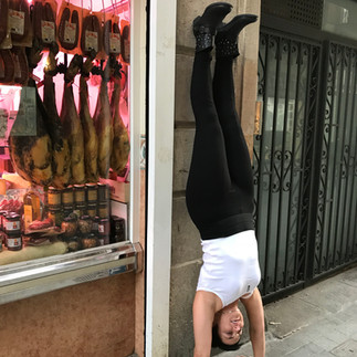 I thought I had your attention! That was me, several years ago, in Barcelona--maybe it was November...when I was upside down. I spent that trip imitating yoga poses inspired by places throughout the city, and this is me, being a ham, next to the famous Spanish hams that are found hanging upside down in the delis.